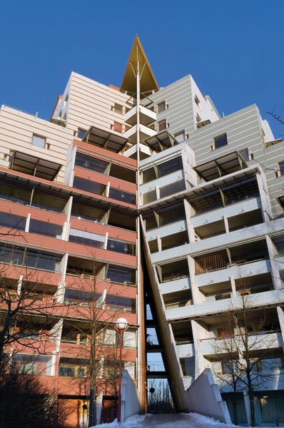 Kan det vara bra för en människa att bo eller arbeta i ett hus som ser ut att rasa ihop vilken sekund som helst? Terrasshuset i Lillhoplax, Helsingfors (Reijo Jallinoja), och nedan Puerta de Europa i Madrid (Philip Johnson och John Burgee).