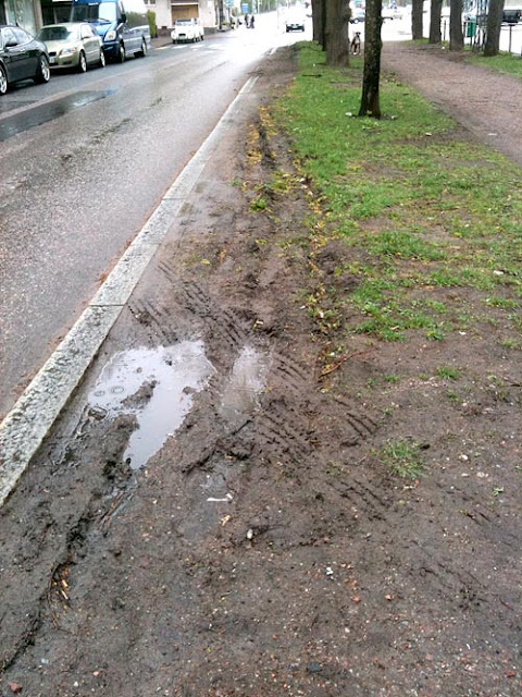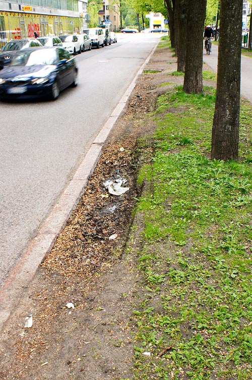 På Munksnäsallén i Helsingfors har parkeringen i flera år varit rena vilda västern. Gräsmattorna mellan träden är sönderkörda av bilar som ”parkerar kreativt”, då man inte orkar gå några meter till den butik man skall besöka. På vissa håll tycks företagsamma individer ha spritt ut sand för att ge systemet en mer permanent prägel. Mönstret känns säkert igen på flera håll…